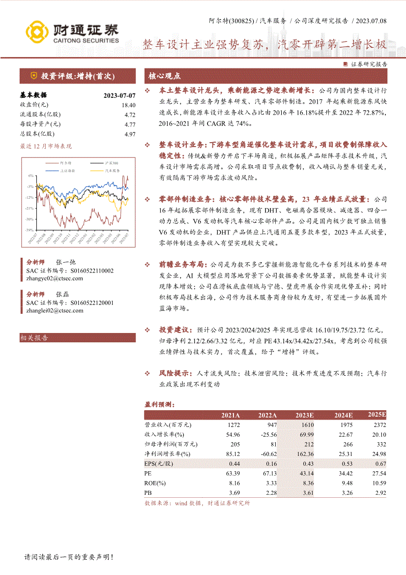 阿尔特(300825) /汽车服务/公司深度研究报告/ 2023.07.08 ! 整车设计主业强势复苏,汽零开辟第二增长极 证券研究报告投资评级:增持(首次) 核心观点基本数据2023-07-07 收盘价(元) 18.40 流通股本(亿股) 4.72 每股净资产(元) 4.77 总股本(亿股) 4.97 最近12月市场表现分析师张一弛SAC证书编号:S02 分析师张磊SAC证书编号:S01 相关报告本土整车设计龙头,乘新能源之势迎来新增长:公司为国内整车设计行业龙头,主营业务为整车研发、汽车零部件制造。